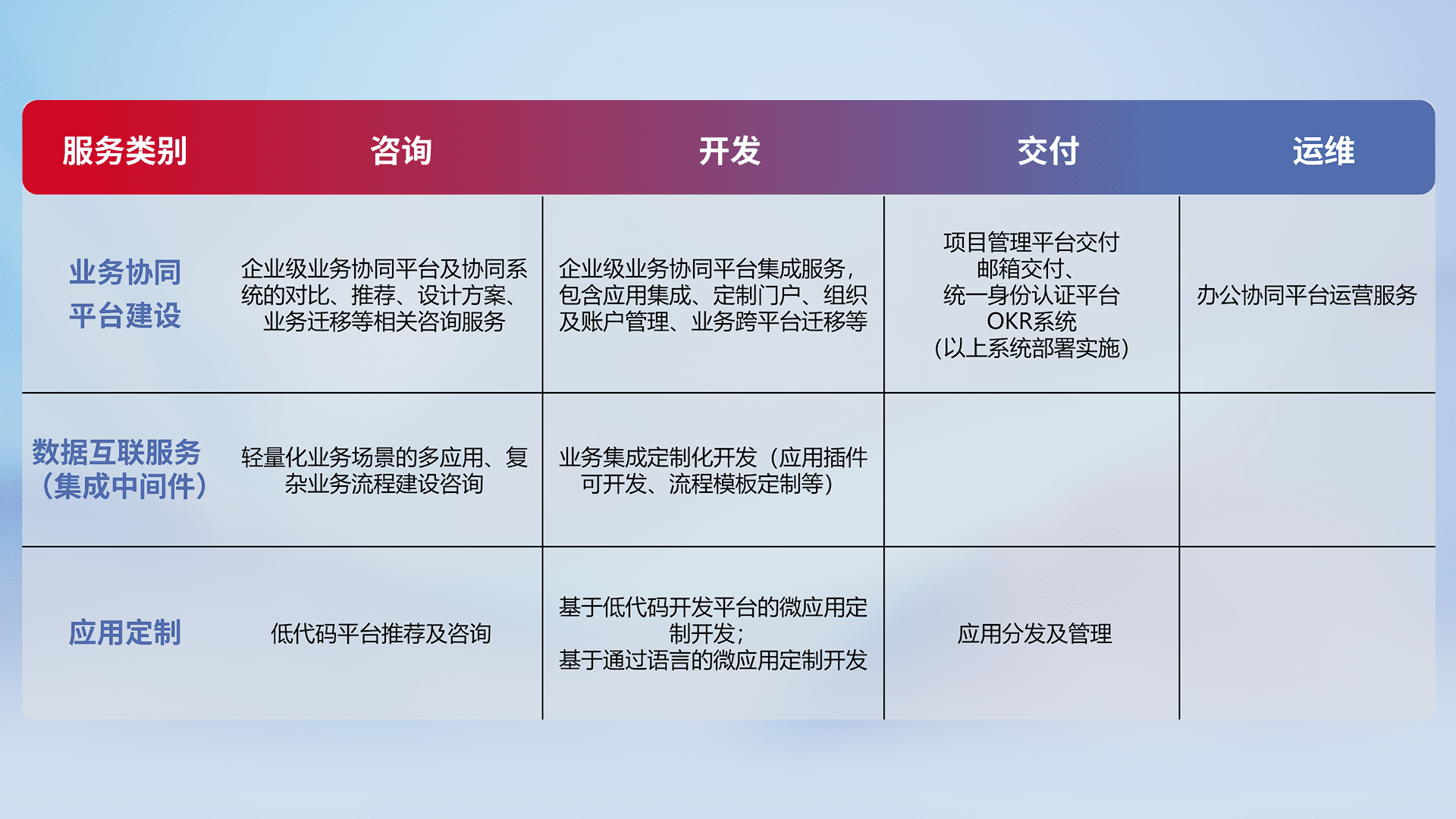 针对特定行业场景的全代码开发服务,,,,精确足满足客户业务服务及系统定制化需求。。。。重点服务汽车、、、农业、、制造业等高端高质量客户。。提供如专业管理系统、、定制化门户、、业务工作台等开发落地。。。。
