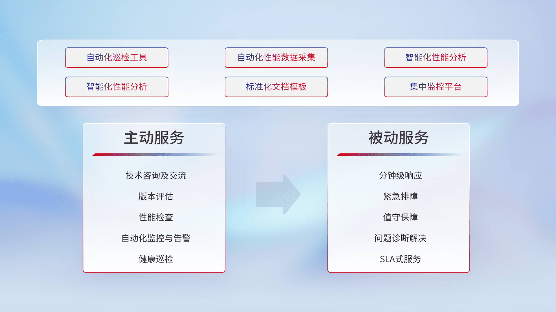 智能化工具和标准化文档,,保障服务质量,,提供主动服务(包含技术咨询、、版本评估、、性能检查、、、自动化监控与告警、、、健康巡检)和被动服务包含(分钟级响应、、、紧急排障、、值守保障、、问题诊断解决、、SLA服务)。。。